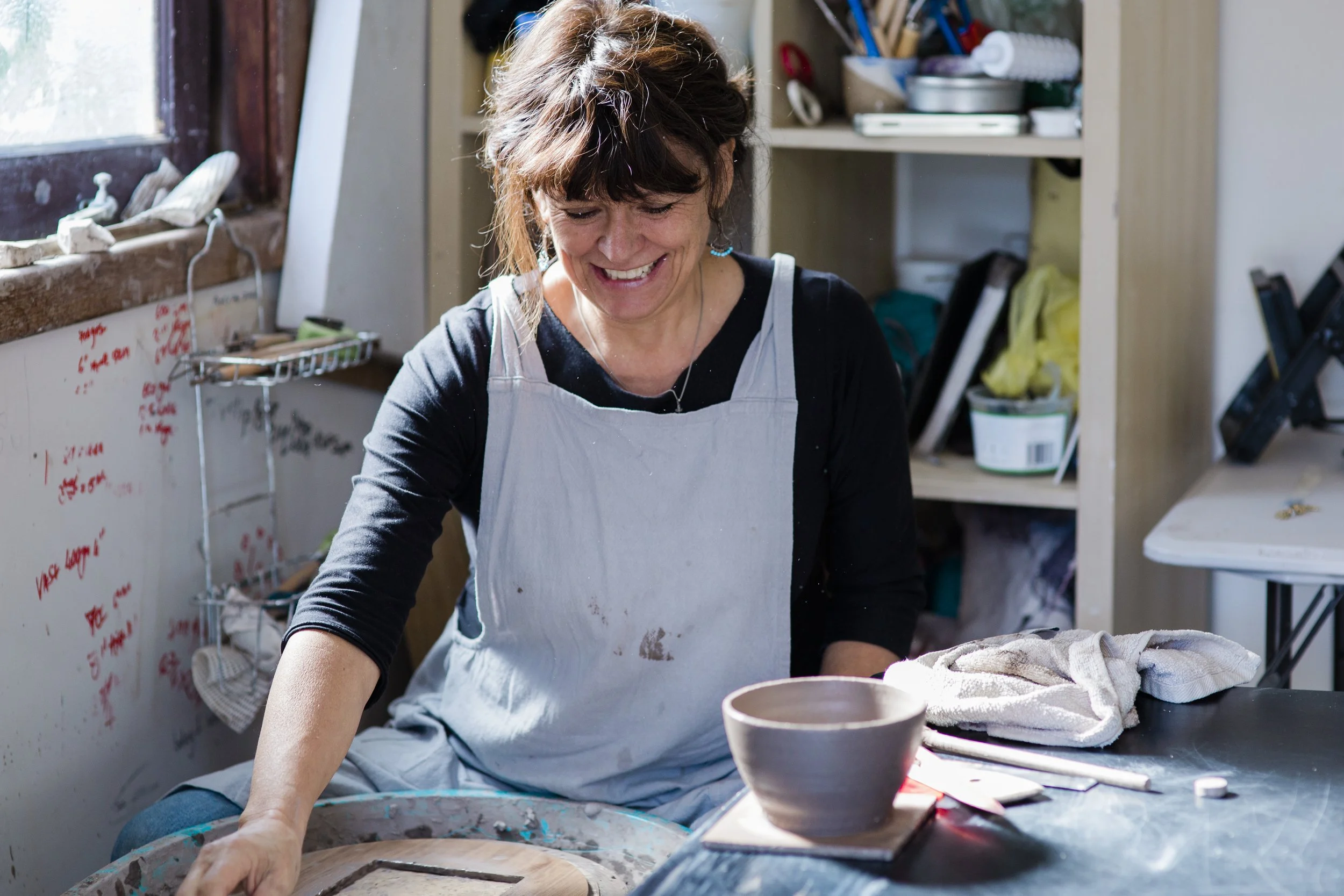 Sally Smith is a full time ceramicist, working and running workshops from her garden studio in Palmyra. Sally creates unique pieces with emotional authenticity, preferring essential beauty over conventional perfection. Her work is all hand thrown, and she will occasionally use hand building techniques.