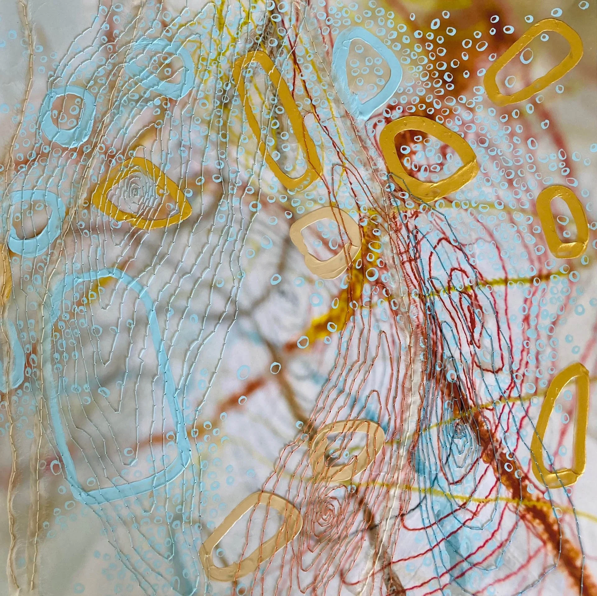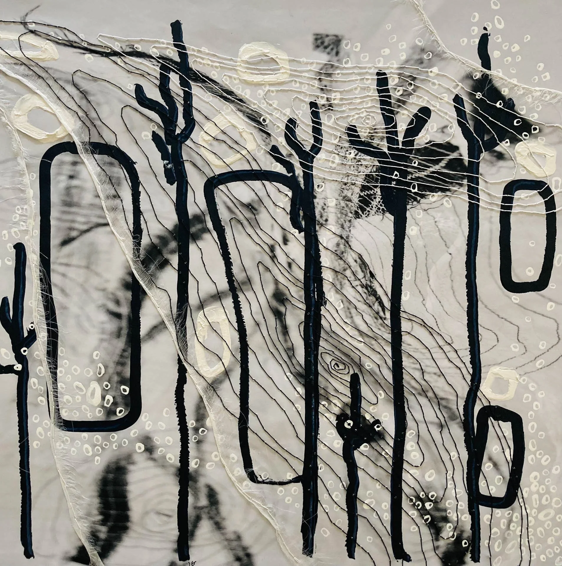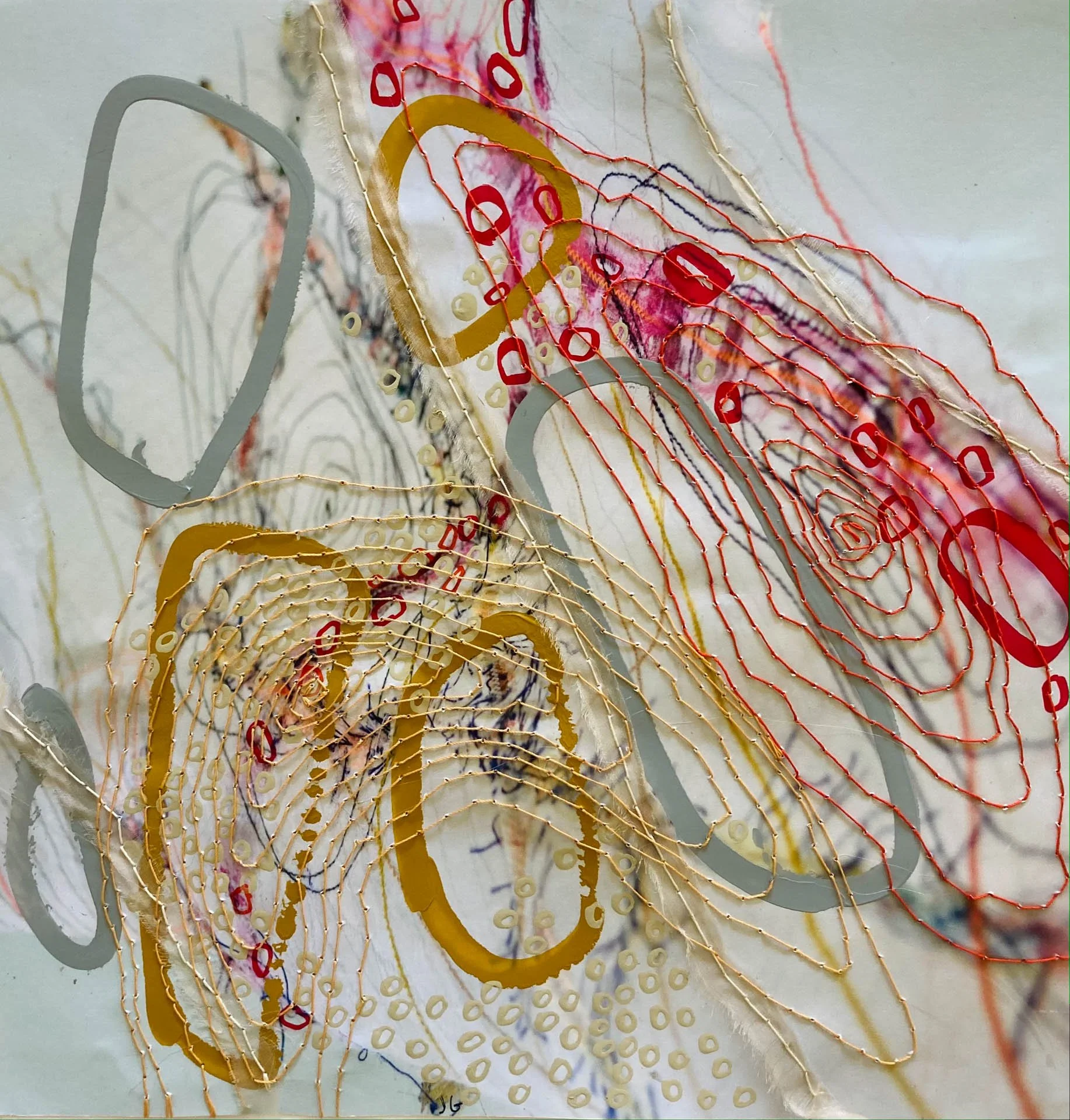 With a background in fashion and textiles, Jennifer took her textiles to canvas in 2003, to create mixed media works of cloth, hand and machine stitch, paint, photography and print, that reflect our nature, urbanity, thought and emotion through mapping, pattern and shape.