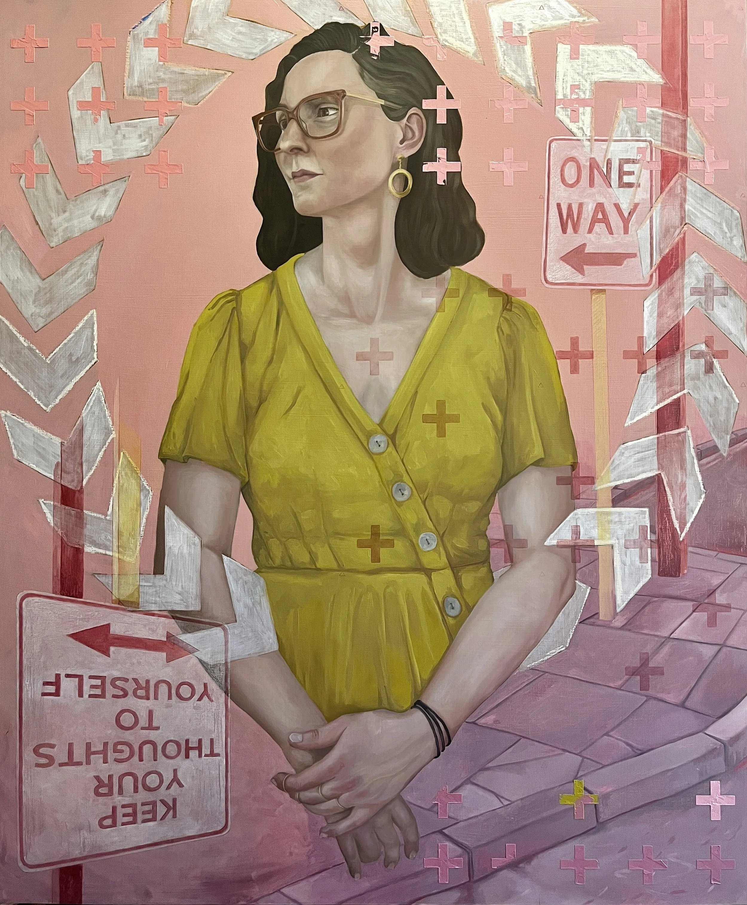 Luke’s work explores the concept of social control, using street signs as an external representation of the internal forms of control that we place upon ourselves. By combining portraiture, text and symbols of social control, themes of mental health awareness, mindfulness and wellbeing are examined.
